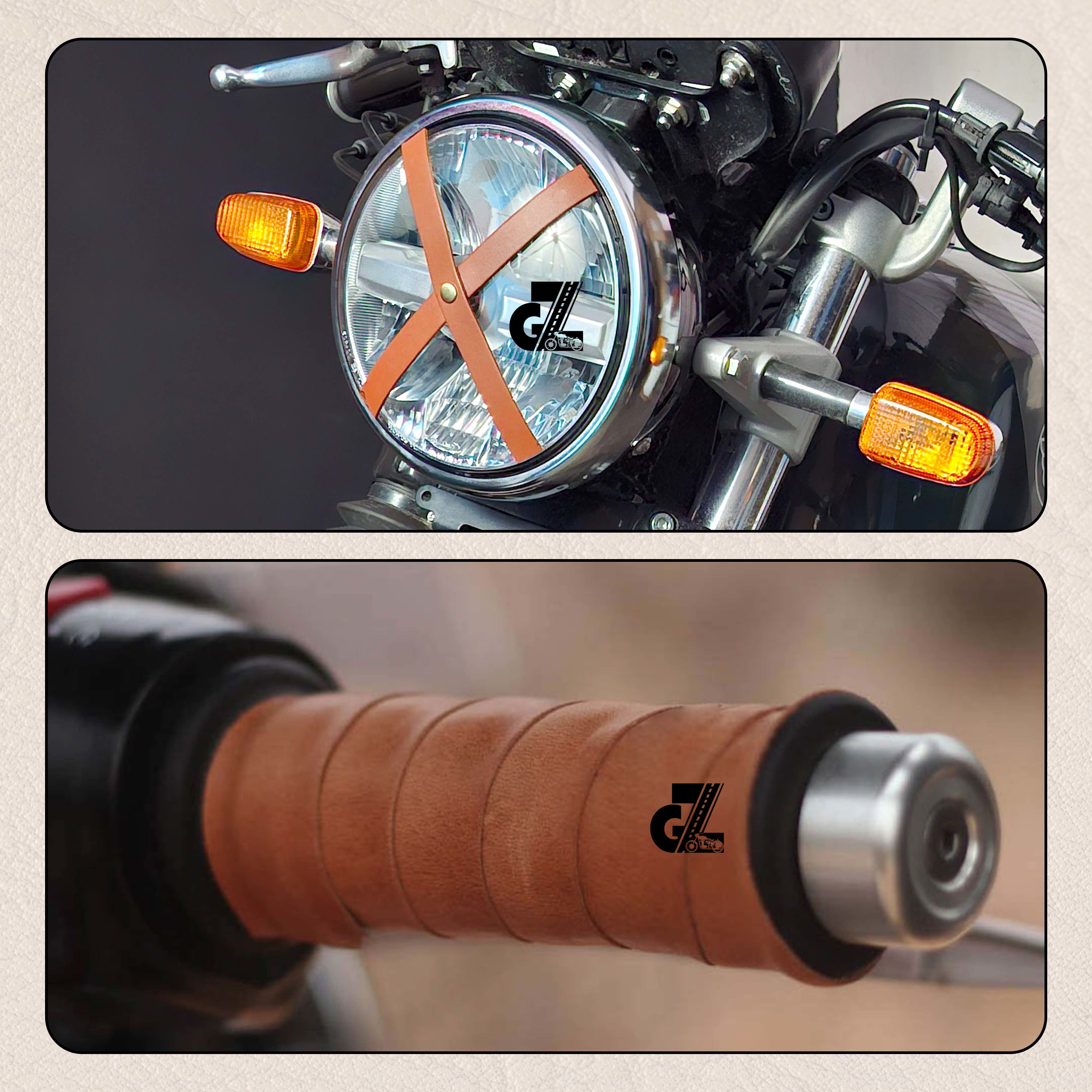 The HEAD LIGHT X & Handgrip Straps is a pure handmade leather headlight & handgrip Straps designed for maximum compatibility with most bikes. Its universal size ensures a perfect fit, providing a durable and stylish addition to your bike. Illuminate your ride with this high-quality, versatile headlight & handgrip Straps.